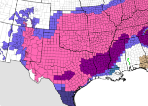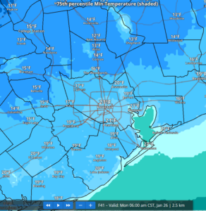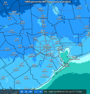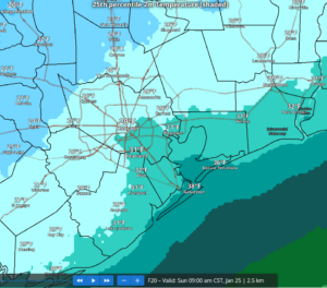 - Freezing rain is likely especially north and west of the metro area Saturday evening and advancing toward the US-59 corridor and to the coast on Sunday
