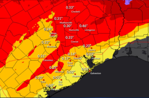 Storm event accumulations range from .05 to .25 of an inch from the US 59 (southwest of Houston)/I-10 (east of Houston) corridor northward with the highest amounts found north of HWY 105 where a longer overlap of freezing temperatures and precipitation is most likely. South of I-10 amounts could range in the .01 to .10 range and the Winter Storm Warning has been extended southward in inland Matagorda and Brazoria Counties. While these amounts may seem low, it only takes a very small amount of ice to create extremely hazardous driving conditions on bridges and overpasses.